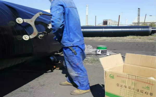 2.在聚乙烯防腐膠帶纏繞時,一定要保持防腐膠帶的張力,如不拉緊,里面留有太多的空氣,在陽光暴曬的情況下,極易起泡,纏繞過程中如焊縫兩側產生空隙,可采用底漆及聚乙烯防腐膠粘帶相容性較好的填料帶膩子填充焊縫兩側。