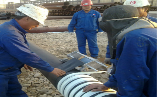 3)、特加強級總厚度≥2.0mm時,可選厚度為2.0mm以搭接膠帶寬度的15~20%方式纏繞一遍;也可只選用厚度為1.0mm以搭接膠帶寬度的50~55%方式纏繞一遍,形成二層結(jié)構(gòu)。
