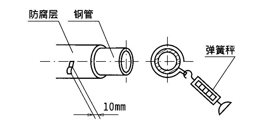 6.4.3 粘結(jié)力(剝離強(qiáng)度):這一指標(biāo)直接關(guān)系到防腐層的質(zhì)量,水的滲透能力與膠帶和鋼材之間的粘結(jié)力有關(guān),所以應(yīng)確保膠帶對(duì)鋼材具有足夠的粘結(jié)力。依據(jù)我國(guó)標(biāo)準(zhǔn)SY/T 0414-2007中的說明,邁強(qiáng)牌熱塑丁基橡膠改性瀝青類防腐膠帶可定稱為專用防腐帶(膠層厚、粘結(jié)力大、帶有防粘膜、可粘結(jié)聚乙烯等材料、能確保質(zhì)量的防腐膠帶)。按我國(guó)SY/T 0414-2007標(biāo)準(zhǔn),剝離強(qiáng)調(diào)的測(cè)量是采用下列方法進(jìn)行的;用刀沿環(huán)向劃開10㎜寬、長(zhǎng)度大于100㎜的膠帶層,直至管體。然后用彈簧秤與管壁成90度角拉開,拉開速度不大于300㎜/min,剝離強(qiáng)度應(yīng)大于18N/㎝,該測(cè)試應(yīng)在纏好膠帶24小時(shí)后進(jìn)行。如下圖所示: